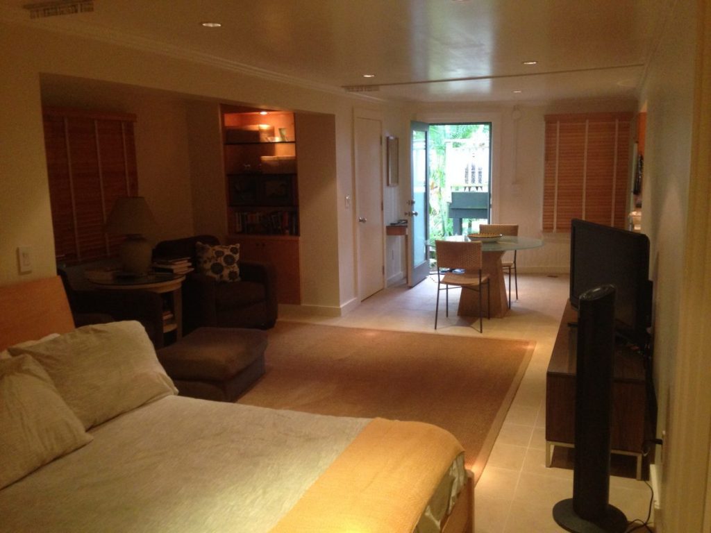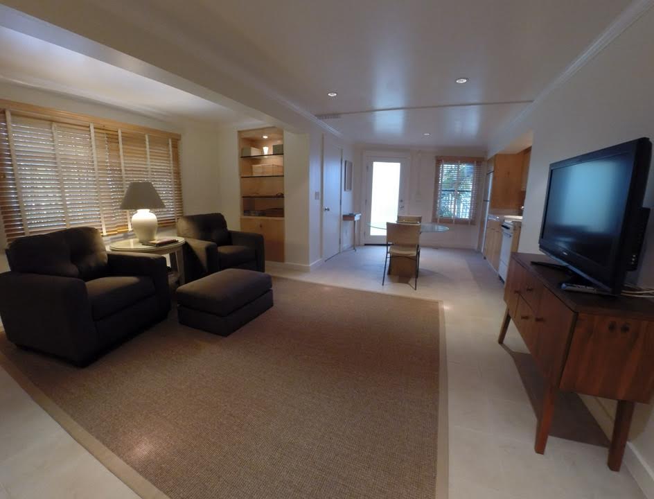 $1,975/month + GET LARGE STUDIO WITH A SEPARATE BEDROOM SPACE * FULLY FURNISHED * Queen Size Bed * Full Granite Kitchen * Full Size Refrigerator w/ice-maker * Oven/Stove * Microwave * Large kitchen table with chairs * Full bath: fully tiled walk-in shower, separate sink * Living room area includes: 2 large club chairs, built in bookcases, wall unit 60" * Widescreen TV * 2 Separate full-size closets * Adjacent laundry room w/ new washer/dryer * Additional lockable storage available * Outdoor shower; all new construction.